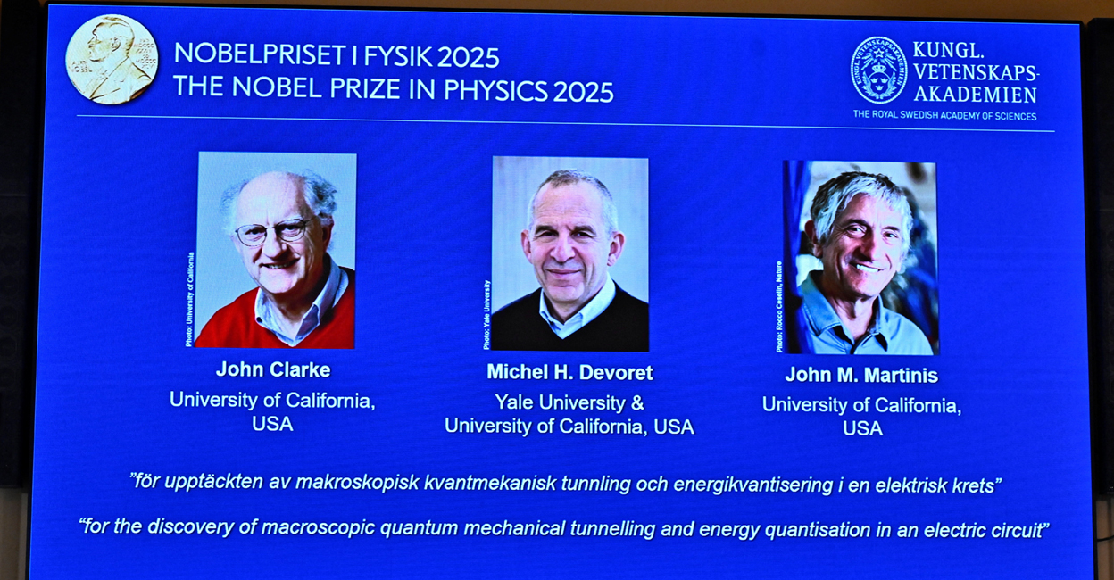 இயற்பியலுக்கான நோபல் ஜான் கிளார்க், மைக்கேல் H. டெவோரெட், ஜான் எம். மார்ட்டினிஸ் ஆகியோருக்கு வழங்கப்பட்டாக அறிவிக்கப்பட்டுள்ளது.