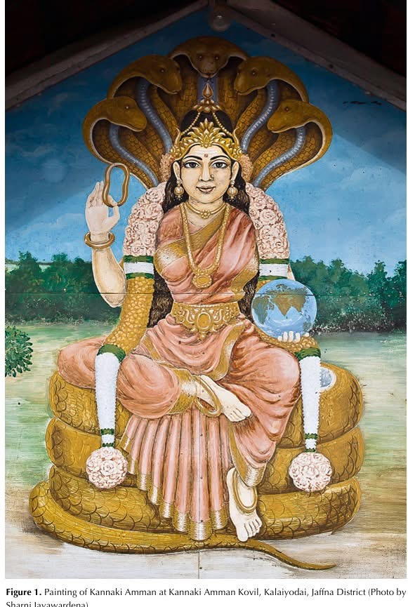 யாழ்ப்பாணத்தில் கண்ணகி வழிபாட்டின் பரவல் பற்றிய ஒரு செவிவழிக்கதை உண்டு. கண்ணகி மதுரையினை எரித்த பின் ஐந்து தலை நாகமாக உருமாறி இலங்கை வந்தாள், அவ்வாறு வரும் போது, முதலில் நயினாதீவில் தங்கினாள் எனவும், பின்பு சுருவில் (வேலணைக்கு அருகேயுள்ள இடம்), வட்டுக்கோட்டை, நவாலி, களையோடை, சுதுமலை, சீரணி, அங்கணாமக்கடவை (கந்தரோடை), அளவெட்டி ஆகிய இடங்களில் அங்கங்கே தங்கி இளைப்பாறி வந்து, முல்லைத்தீவு வற்றாப்பளை எனும் இடத்துக்குச் சென்றாள் என அக் கதையில் கண்ணகியின் செல்லுகை நீண்டு செல்லும்.