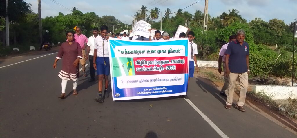 சர்வதேச உள நல தினத்தை முன்னிட்டு பருத்தித்துறை ஆதார வைத்தியசாலை ஏற்பாடு செய்த யினரால் உள நல விழிப்புணர்வு நடை பவனி இன்று காலை 7:30 மணியளவில் நெல்லியடி மாலை சந்தையிலிருந்து ஆரம்பமாக மந்திகை சந்தி, சிலையடி சந்தி, ஊடாக சரசாலை வீதி , மந்திகை சந்தை வழியாக பருத்தித்துறை ஆதார வைத்தியசாலைக்கு சென்றது