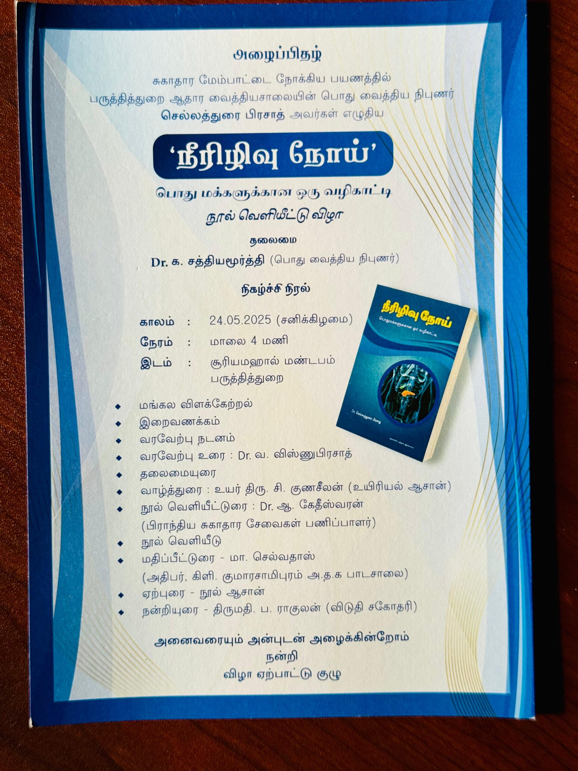 பருத்தித்துறை ஆதார வைத்திய சாலையின் பொது வைத்திய நிபுணர் செல்லத்துரை பிரசாத் எழுதிய அ’நீரிழிவு நோய்” பொதுமக்களுக்கான ஒரு வழைகாட்டி நூல் வெஈயீட்டு விழா பருத்தித்துறை சூரிய மஹால் மண்டபத்தில் சனிக்கிழமை [25] பிற்பகல் 4 மணிக்கு பொது வைத்திய நிபுணர் டாக்டர் க. சத்தியமூர்த்தி தலைமையில் நடைபெறும்.