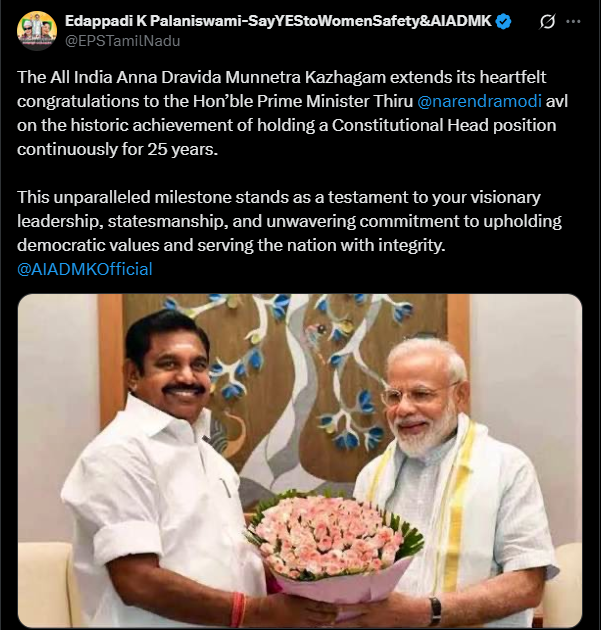25 ஆண்டுகளாக அரசியலமைப்புச் சட்டத் தலைவராக தொடர்ந்து பதவி வகித்து வரலாற்றுச் சாதனை படைத்ததற்காக, மாண்புமிகு பிரதமர் மோடிக்கு அனைத்திந்திய அண்ணா திராவிட முன்னேற்றக் கழகம் தனது மனமார்ந்த வாழ்த்துக்களைத் தெரிவித்துக் கொள்கிறது.