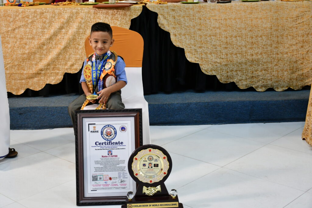 சோழன் உலக சாதனை படைத்த மிர்திக் தேவிற்கு சட்டகம் செய்யப்பட்ட சான்றிதழ், பதக்கம், அடையாள அட்டை, நினைவுக் கேடயம் மற்றும் பைல் போன்றவை வழங்கிப் பாராட்டப்பட்டது.