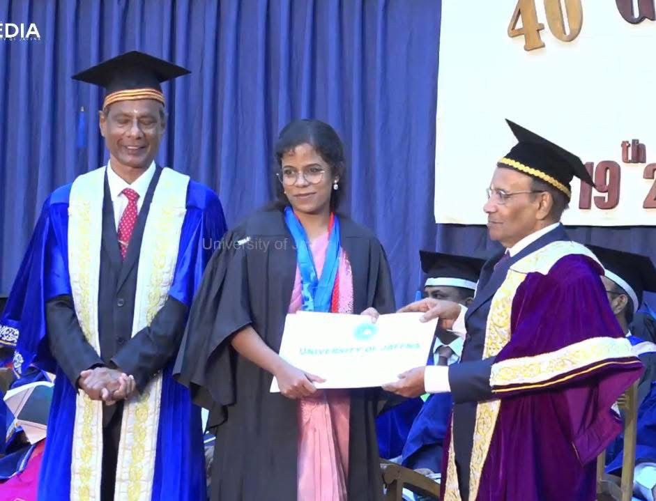 நேற்று நடைபெற்ற யாழ்ப்பாணப் பல்கலைக்கழக பட்டமளிப்பு விழாவில் மருத்துவ பீடத்தைச் சேர்ந்த அபிராமி நற்குணம் என்ற மாணவி மருத்துவ கற்கையின் போது பல்வேறு துறைகளிலும் தனது சிறப்பான திறமையை வெளிப்படுத்தி 8 தங்கப் பதக்கங்களைப் பெற்றுக் கொண்டார்.