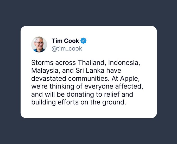 இந்தோனேசியா, மலேசியா, தாய்லாந்து மற்றும் இலங்கை ஆகிய நாடுகளில் இயற்கை பேரழிவுகள் ஏற்பட்டதைத் தொடர்ந்து ஆசியாவில் நிவாரணப் பணிகளுக்கு ஆப்பிள் நிறுவனம் நன்கொடை அளிக்க முன்வந்துள்ளது.