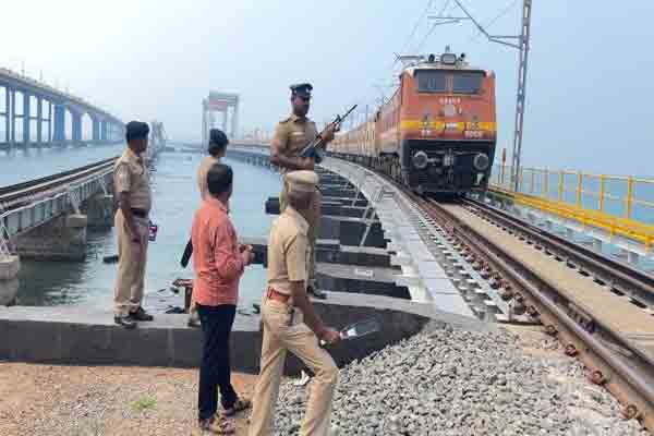 பாம்பன் கடலில் புதிதாக கட்டப்பட்டுள்ள புதிய புகையிரத பாலத்தில் தமிழ்நாடு பொலிஸார் ஆயுதம் ஏந்தி பாலத்தின் இருபுறமும் பாதுகாப்பு பணியில் ஈடுபட்டு வருகின்றனர்.