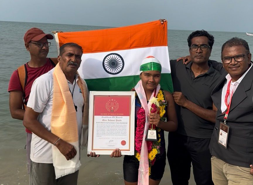 மகாராஷ்டிரா மாநிலம் நாக்பூரைச் சேர்ந்த கமலேஷ் விட்டல்ராவ் பாண்டே மற்றும் அருணா கமலேஷ் பாண்டே தம்பதியினரின் 17 வயதான மகள் ஈஸ்வரி என்னும் மாற்றுத்திறனாளி சிறுமியே, இலங்கையின் தலைமன்னாரிலிருந்து இந்தியாவின் தனுஷ்கோடி அரிச்சல்முனை வரையிலான பாக்கு நீரிணையை 11 மணி நேரம் 15 நிமிடங்களில் நீந்தி கடந்து இந்த சாதனையை புரிந்துள்ளார்.