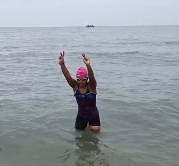 இதற்கு முன்னர் தலைமன்னார், தனுஷ்கோடி இடையிலான பாக்கு நீரிணையை மும்பையைச் சேர்ந்த ஆட்டிசத்தால் பாதிக்கப்பட்ட 13 வயதான சிறுமி ஜியா ராய் கடந்த 2022 நீந்திக் கடந்தார்.