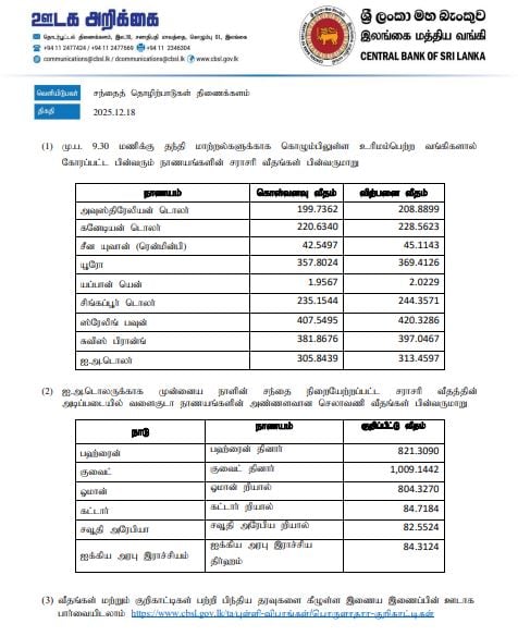 இலங்கை மத்திய வங்கி வெளியிட்டுள்ள உத்தியோகபூர்வ நாணய மாற்று விபரங்களின் அறிக்கை கீழே இணைக்கப்பட்டுள்ளது.