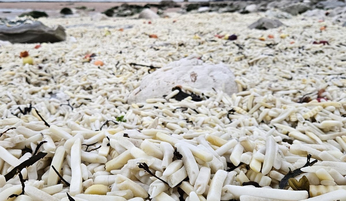 அந்தக் கொள்கலன்கள் கரைக்கு வந்ததைத் தொடர்ந்து, அதிலிருந்த ஆயிரக்கணக்கான சிப்ஸ் பாக்கெட்டுகள் கடற்கரை முழுவதும் சிதறிக் கிடக்கின்றன.
