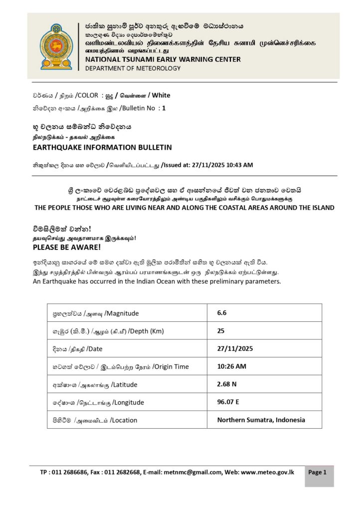 கடலோரப் பகுதிகளிலும் அதன் அருகிலும் வசிக்கும் மக்கள் விழிப்புடன் இருக்குமாறு வாளிமண்லவியல் திணைக்களம் அறிவுறுத்தியுள்ளது.