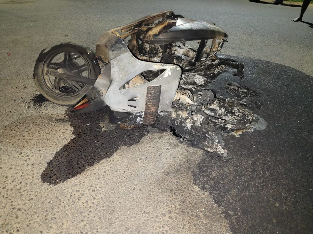 வீட்டில் நிறுத்தப்பட்டிருந்த மோட்டார் சைக்கிளை சுமார் ஒரு கிலோமீற்றர் தொலைவில் உள்ள மல்லாகம் வீதியில் உள்ள சந்தியின் நடுவில் நிறுத்தி தீ வைத்ததாக தெரிவிக்கப்பட்டுள்ளது.