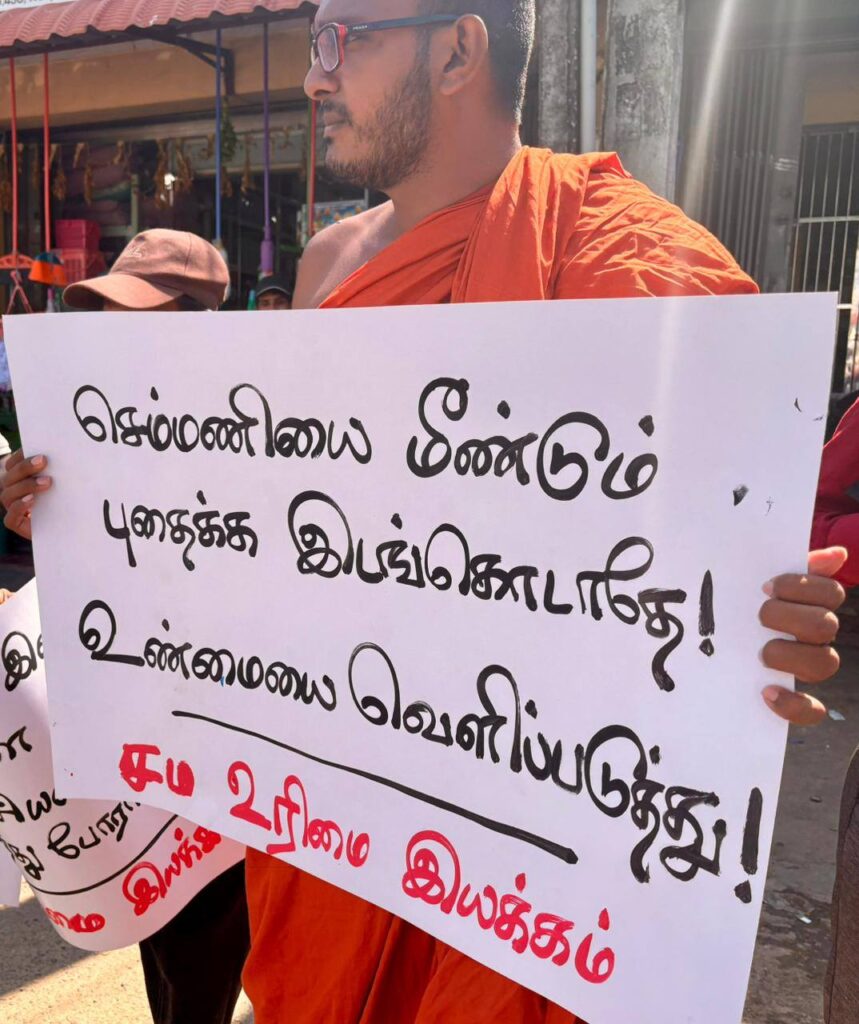 “அனைத்து காணாமல் ஆக்கல்களுக்கும் இப்போதாவது நீதியை வழங்கு, செம்மணியை மீண்டும் புதைக்க இடம்கொடுக்காமல் உண்மையை வெளிப்படுத்து, மீண்டும் மீண்டும் அடக்குமுறைகள் வேண்டாம், பயங்கரவாத தடைச் சட்டத்தை உடனே நீக்கு, அனைத்து தேசிய இனங்களுக்குமான உரிமையை உறுதிசெய்” என்ற வாசகங்களை எழுதிய பதாகைகளை ஏந்தியவாறு போராட்டத்தில் ஈடுபட்டனர்.