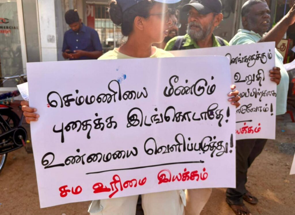 செம்மணியை புதைகுழி விவகாரத்தினை மீண்டும் புதைக்காமல் உண்மையை வெளிப்படுத்து என்ற கோசத்துடன் நேற்றையதினம் யாழ்ப்பாண பேருந்து நிலையத்திற்கு முன்னர் போராட்டம் ஒன்று இடம்பெற்றது.