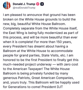 இது தொடர்பில் கருத்து வெளியிட்ட ட்ரம்ப் “நாட்டின் ஒவ்வொரு ஜனாதிபதியும், வெள்ளை மாளிகை வளாகத்தில் மிகப் பிரமாண்ட விருந்துகள், கலைநிகழ்ச்சிகளுக்காக மக்களைத் தங்க வைக்க ஒரு பால்ரூம் வேண்டும் என்று 150 ஆண்டுகளுக்கும் மேலாகக் கனவு கண்டு வந்தனர். வரி செலுத்துவோருக்கு எந்த சிரமமும் இன்றி இந்த கனவை செயல்படுத்திய முதல் ஜனாதிபதி நான் என பெருமைப்படுகிறேன்” என அவர் குறிப்பிட்டுள்ளார்.