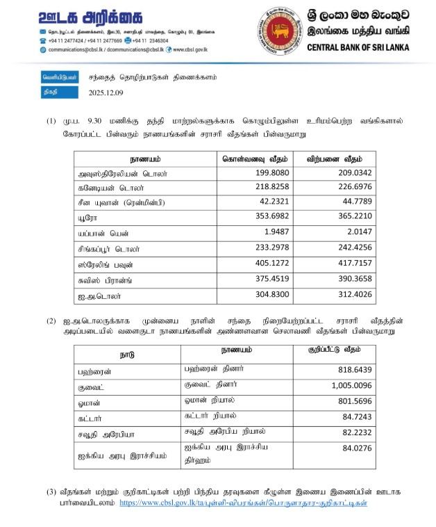 இலங்கை மத்திய வங்கி இன்று செவ்வாய்க்கிழமை (09) வெளியிட்டுள்ள நாணயமாற்று விகிதத்தின் அடிப்படையில் அமெரிக்க டொலரின் கொள்வனவு விலை ரூபா 312.4026 ஆகவும் விற்பனை விலை ரூபா 304.8300 ஆகவும் பதிவாகியுள்ளமை குறிப்பிடத்தக்கது.