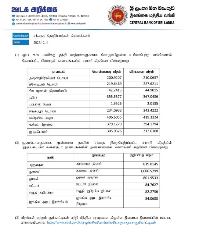 இலங்கை மத்திய வங்கியினால் வெளியிடப்பட்டுள்ள இன்றைய நாணய மாற்று விகித தகவல்கள் பின்வருமாறு ,