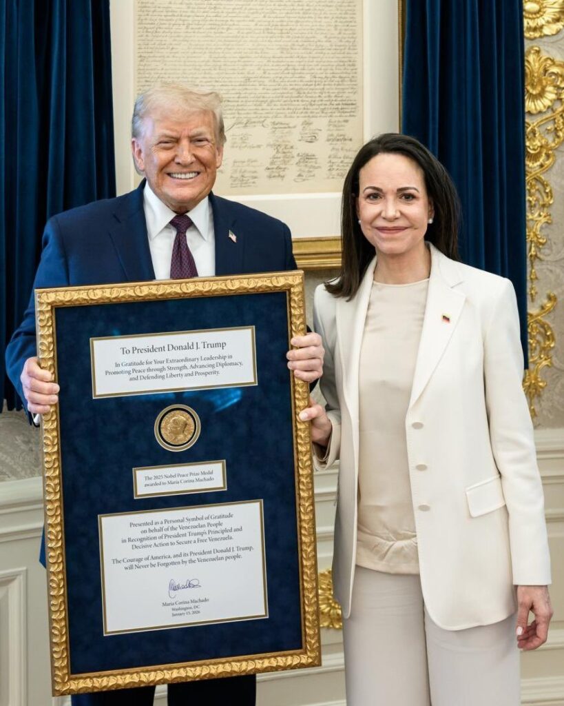 வெனிசுவேலாவின் எதிர்க்கட்சித் தலைவரான மரியா கொரினா மச்சாடோ (Maria Corina Machado) அமெரிக்க ஜனாதிபதி டொனால்ட் ட்ரம்பை நேரில் சந்தித்து தனது அமைதிக்கான நோபல் பரிசு பதக்கத்தை வழங்கியுள்ளார்.